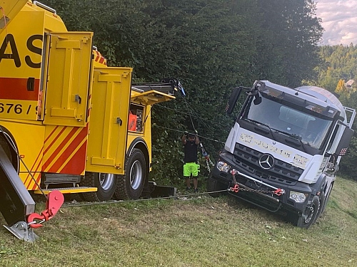 Ein Betonmischfahrzeug war von einer Schotterstraße abgekommen