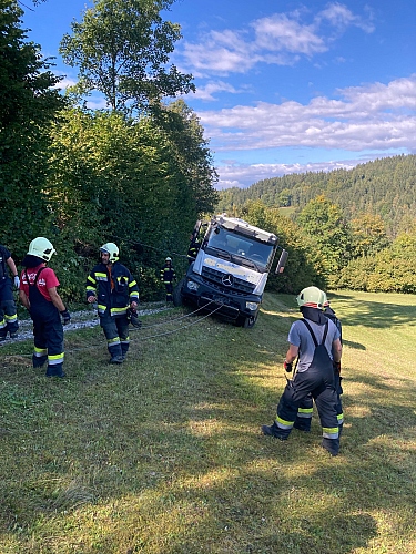 und drohte umzustürzen. Mittels zweier Greifzüge wurde der LKW