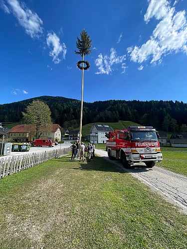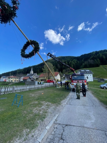Mittels SRF-K Ferlach wurde die FF-Zell Pfarre beim Aufstellen des Maibaumes vor der Volksschule unterstützt.