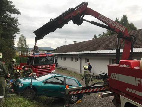 Übungsannahme war eine unter einem PKW eingeklemmte Person an einer Böschung. Das Fahrzeug musste gesichert, langsam angehoben und die Person geborgen werden.